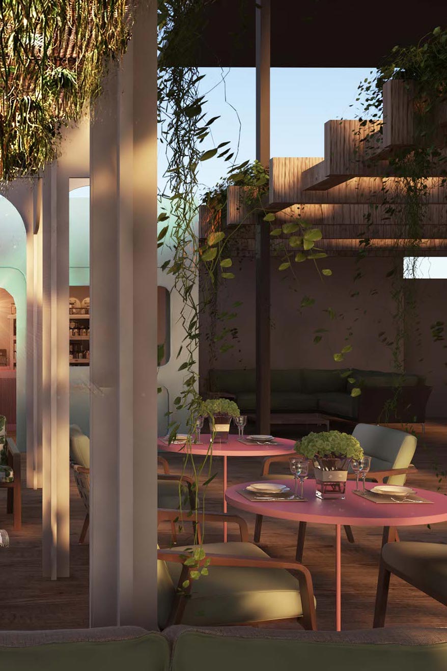 The L shaped footprint of the house occupies the northern and western edges of the plot where the largest slope is located thus allowing for a greater height at the living room, bar and ballroom and winning a third level in a semi basement where the yoga studio, cellar and some of the services are located. The removed soil from the excavation of the foundations and semi basement was used to level the garden that becomes accessible from the main entrance, ground floor and yoga studio.