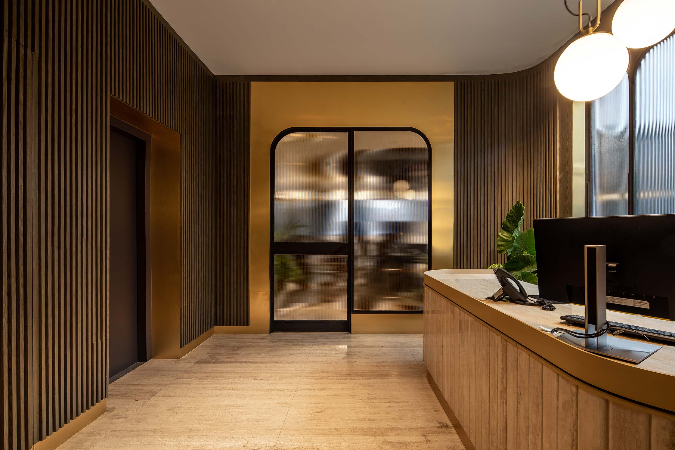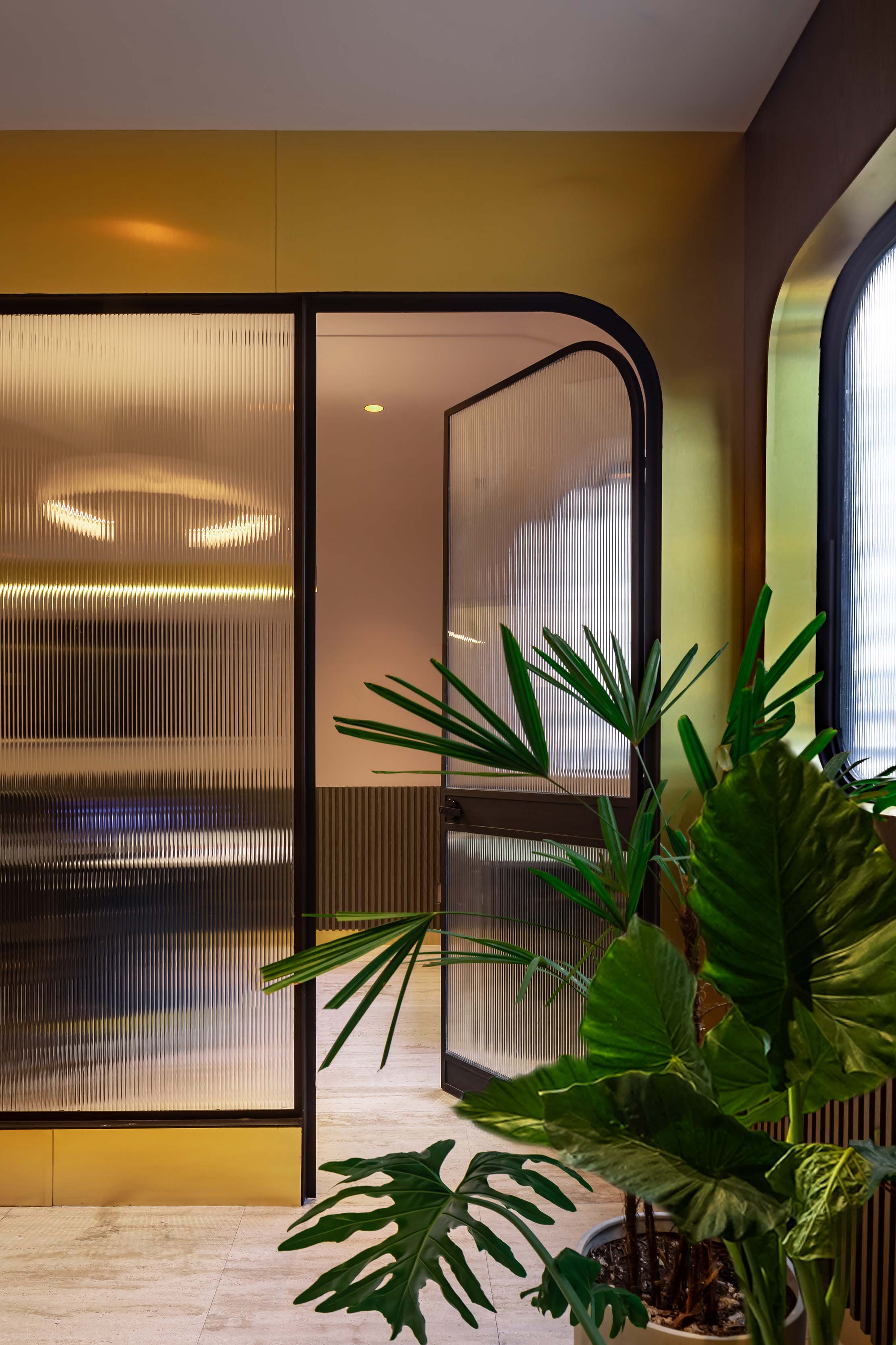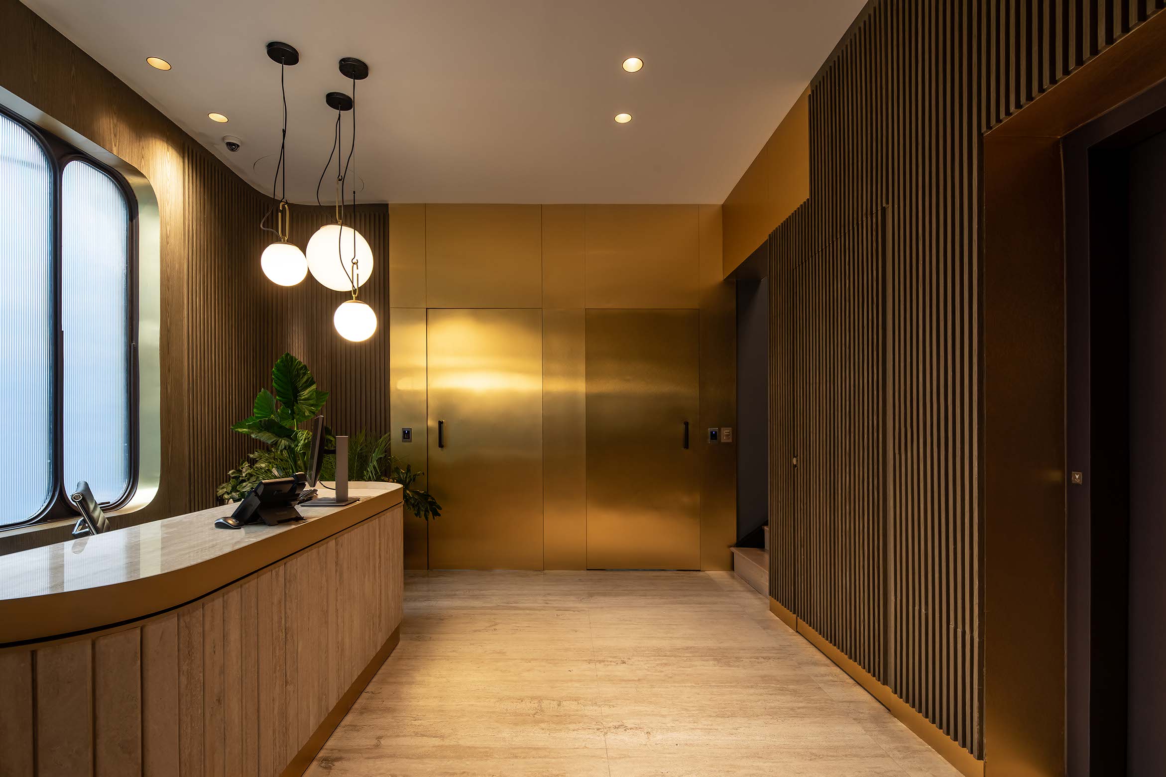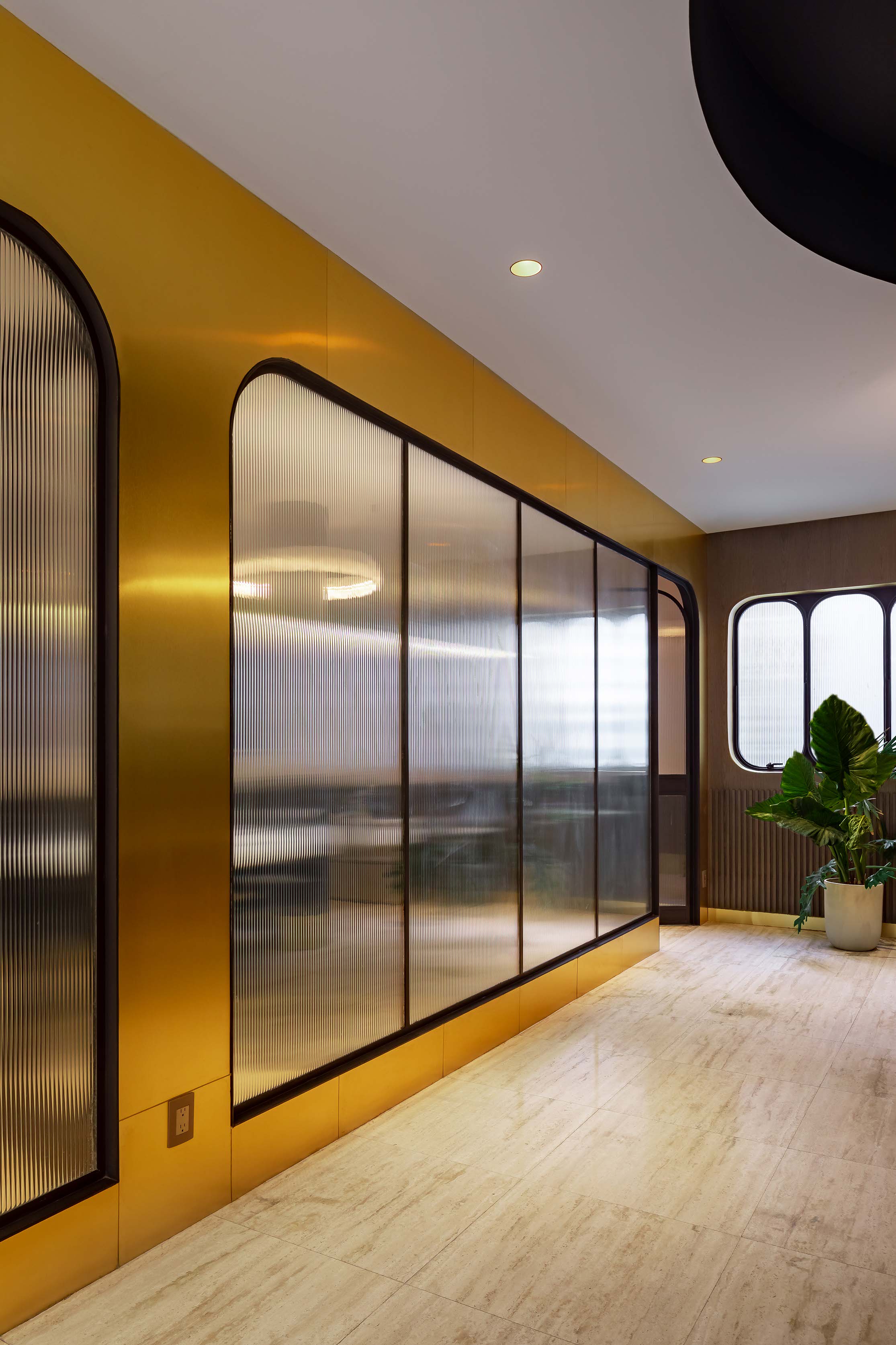 En contraste el plafón está compuesto por una intrincada superficie facetada que se adapta a la cambiante altura del espacio y a los elementos estructurales del edificio, el cual está terminado con un acabado espejo de aluminio anodizado dorado cortado con láser que refleja la vista en planta del local y afila los vértices del volumen creando puntos de interés para los clientes mientras son atendidos en los asientos reclinables.