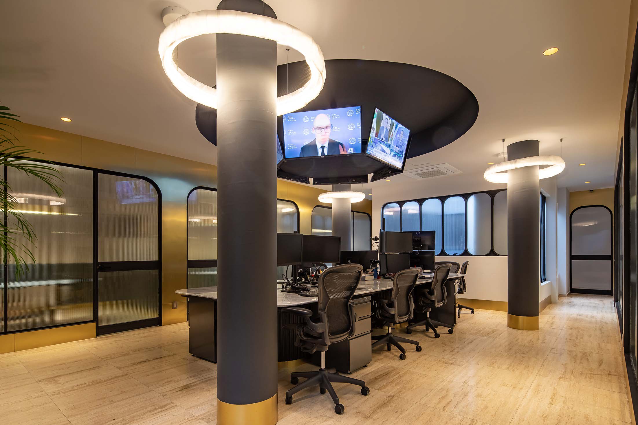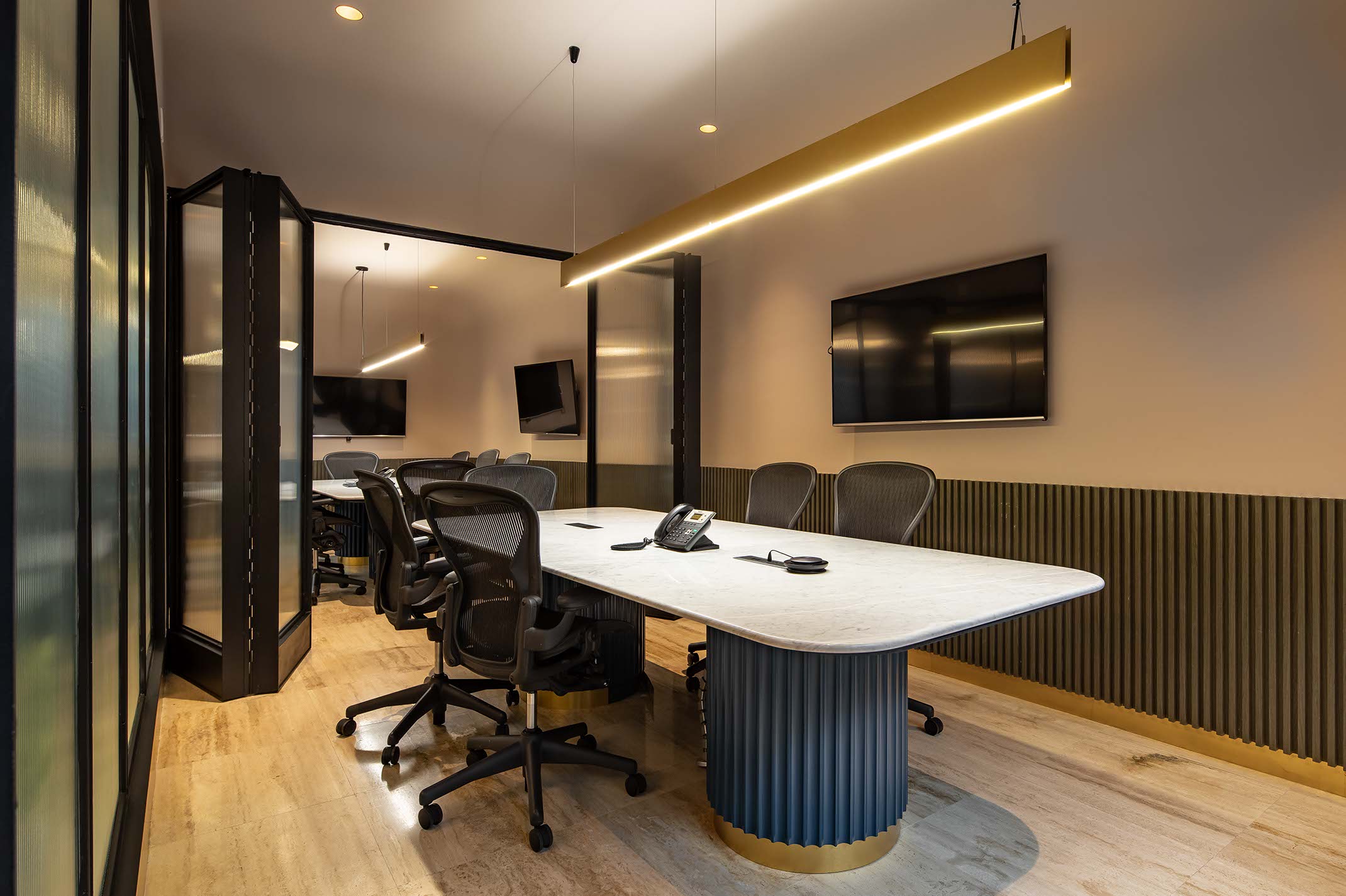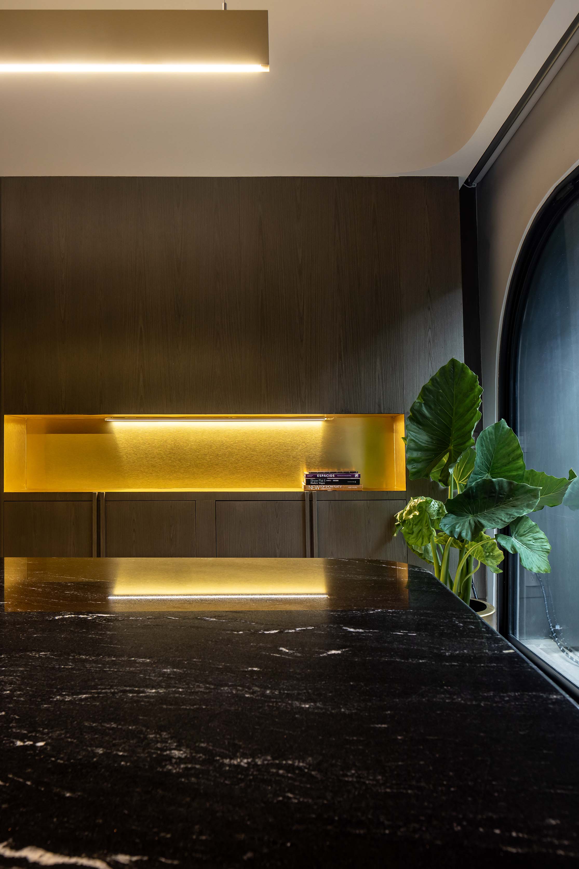 En contraste el plafón está compuesto por una intrincada superficie facetada que se adapta a la cambiante altura del espacio y a los elementos estructurales del edificio, el cual está terminado con un acabado espejo de aluminio anodizado dorado cortado con láser que refleja la vista en planta del local y afila los vértices del volumen creando puntos de interés para los clientes mientras son atendidos en los asientos reclinables.