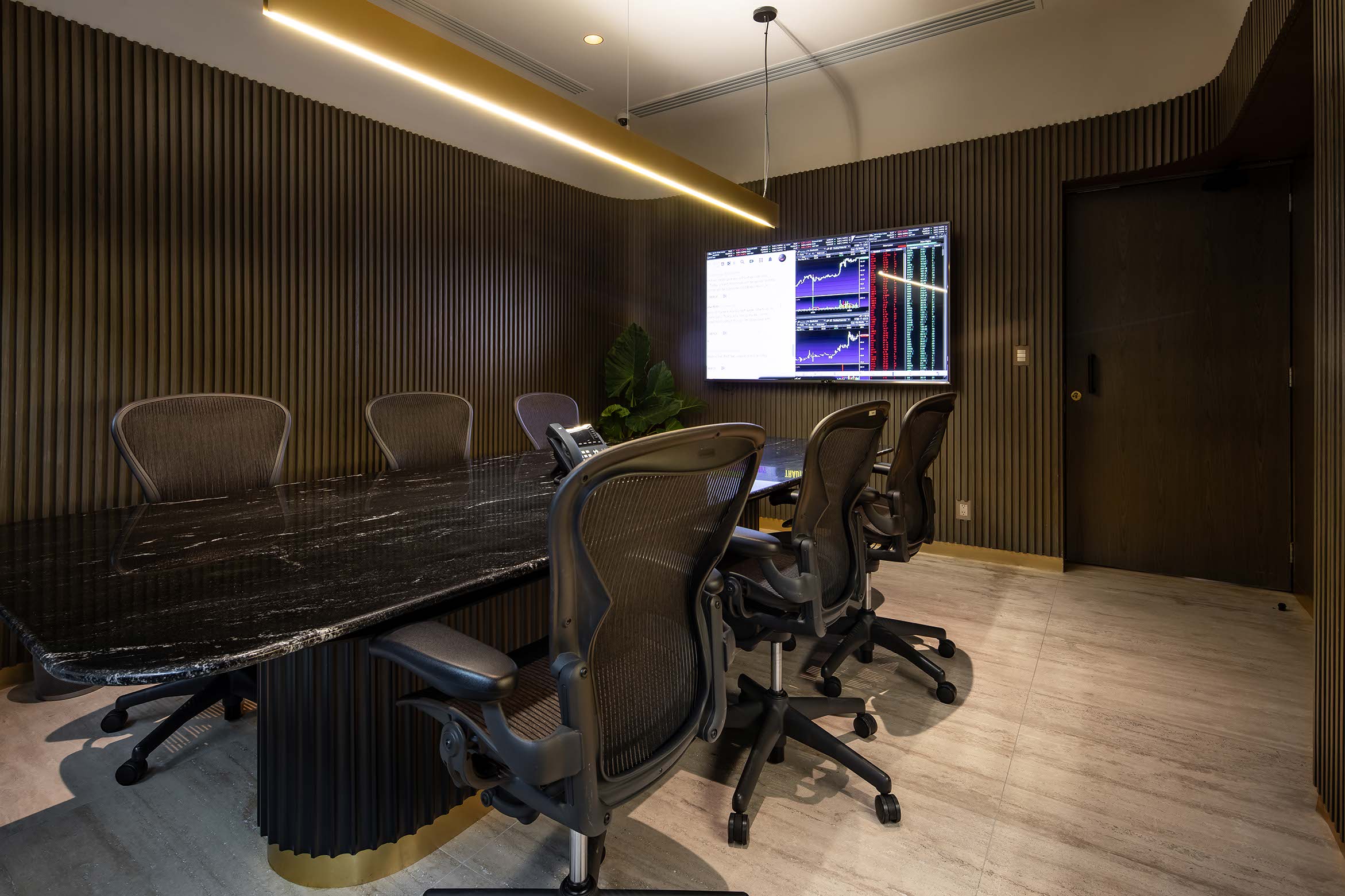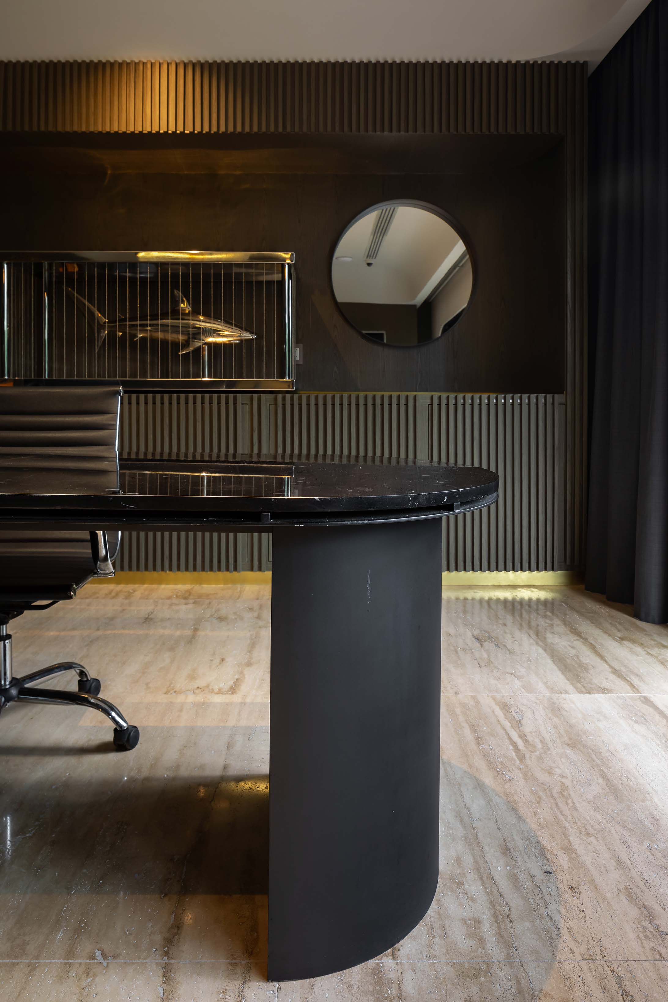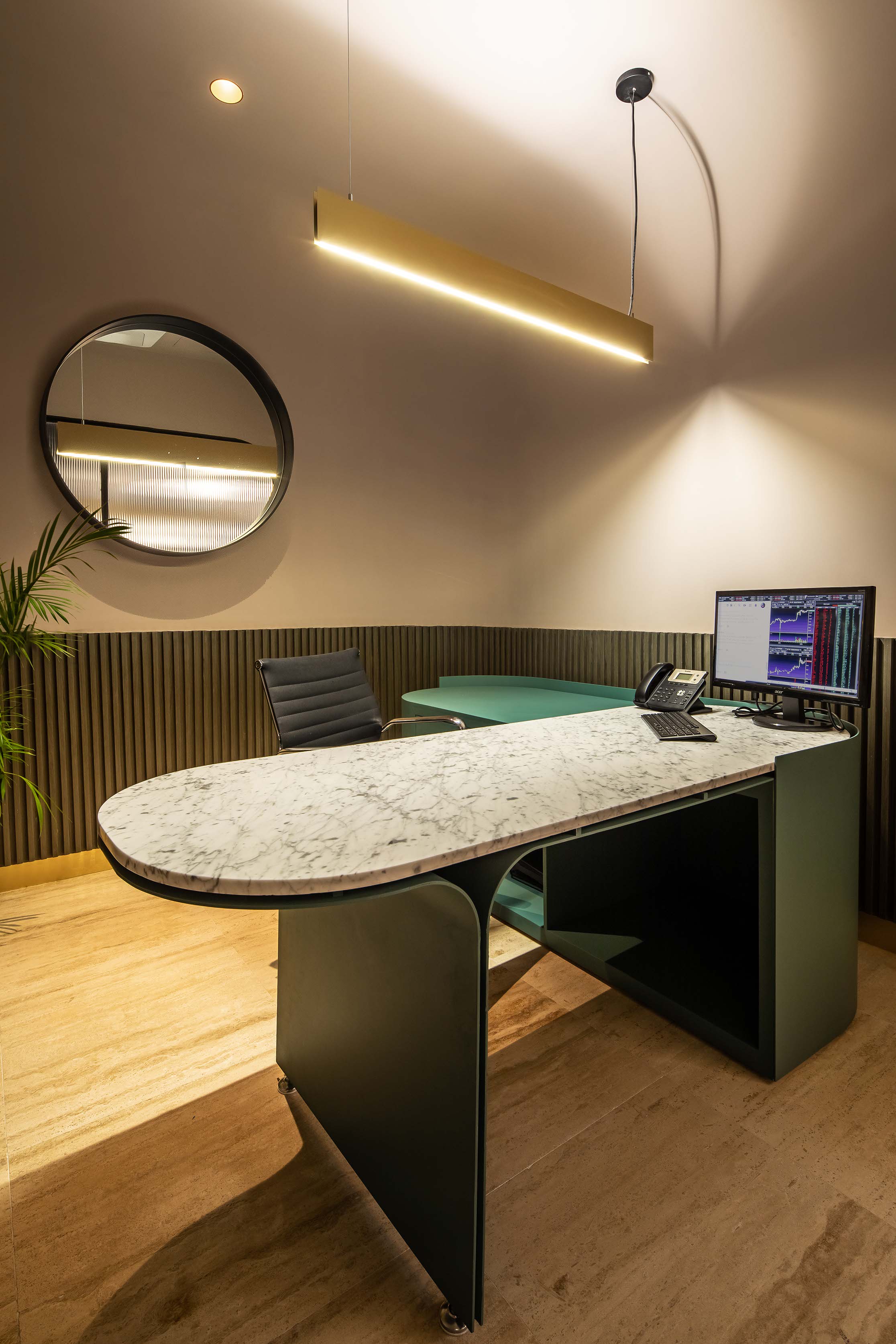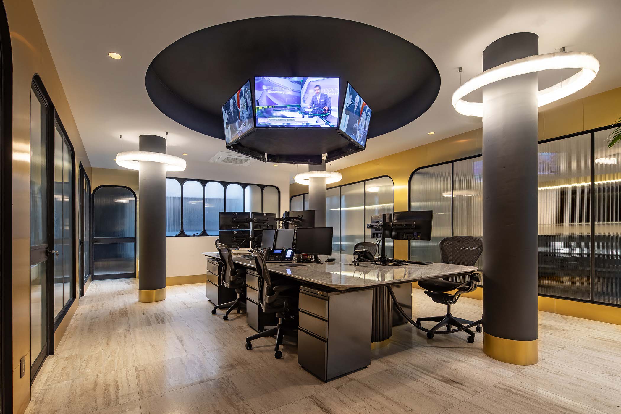 En contraste el plafón está compuesto por una intrincada superficie facetada que se adapta a la cambiante altura del espacio y a los elementos estructurales del edificio, el cual está terminado con un acabado espejo de aluminio anodizado dorado cortado con láser que refleja la vista en planta del local y afila los vértices del volumen creando puntos de interés para los clientes mientras son atendidos en los asientos reclinables.