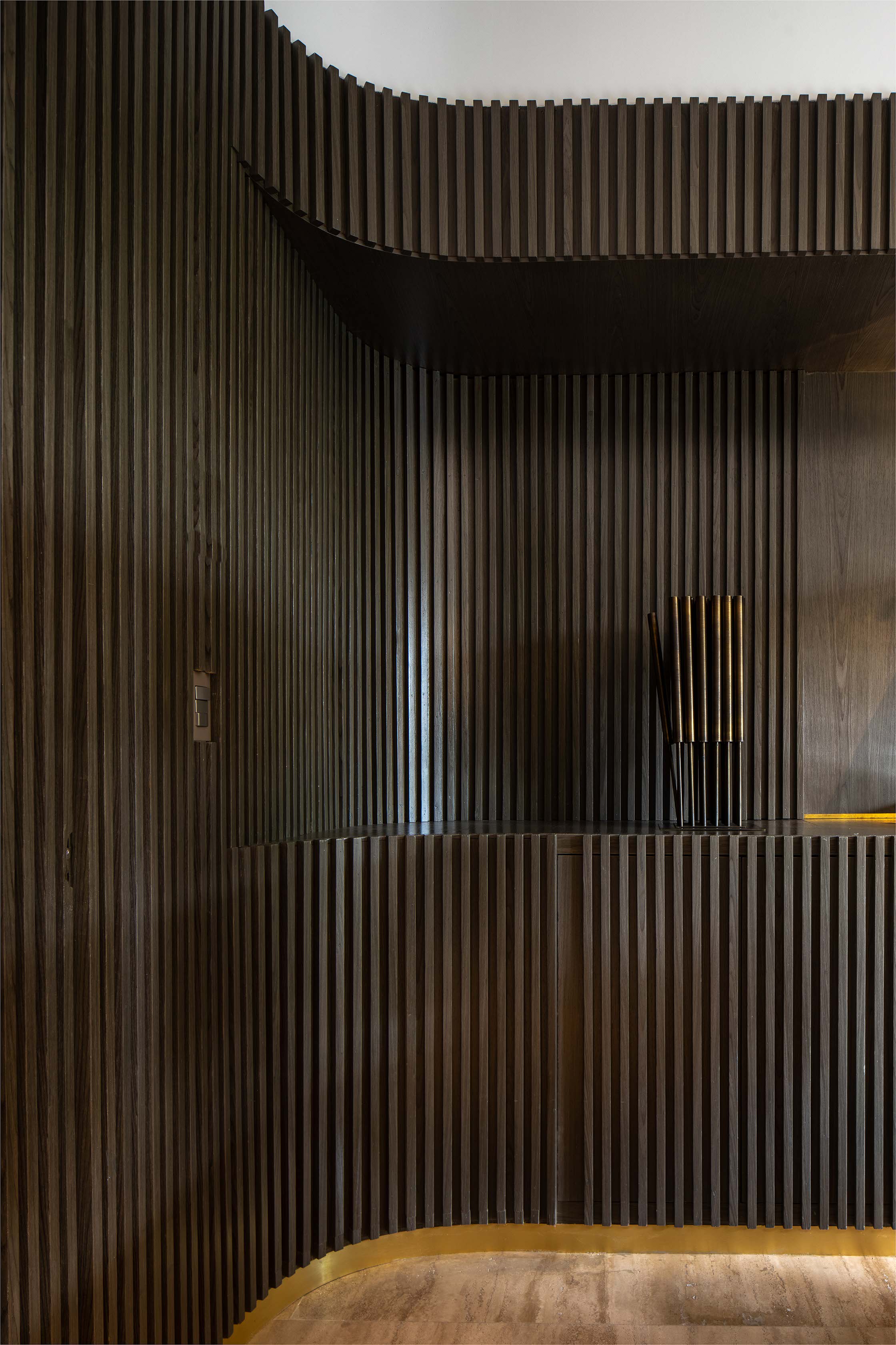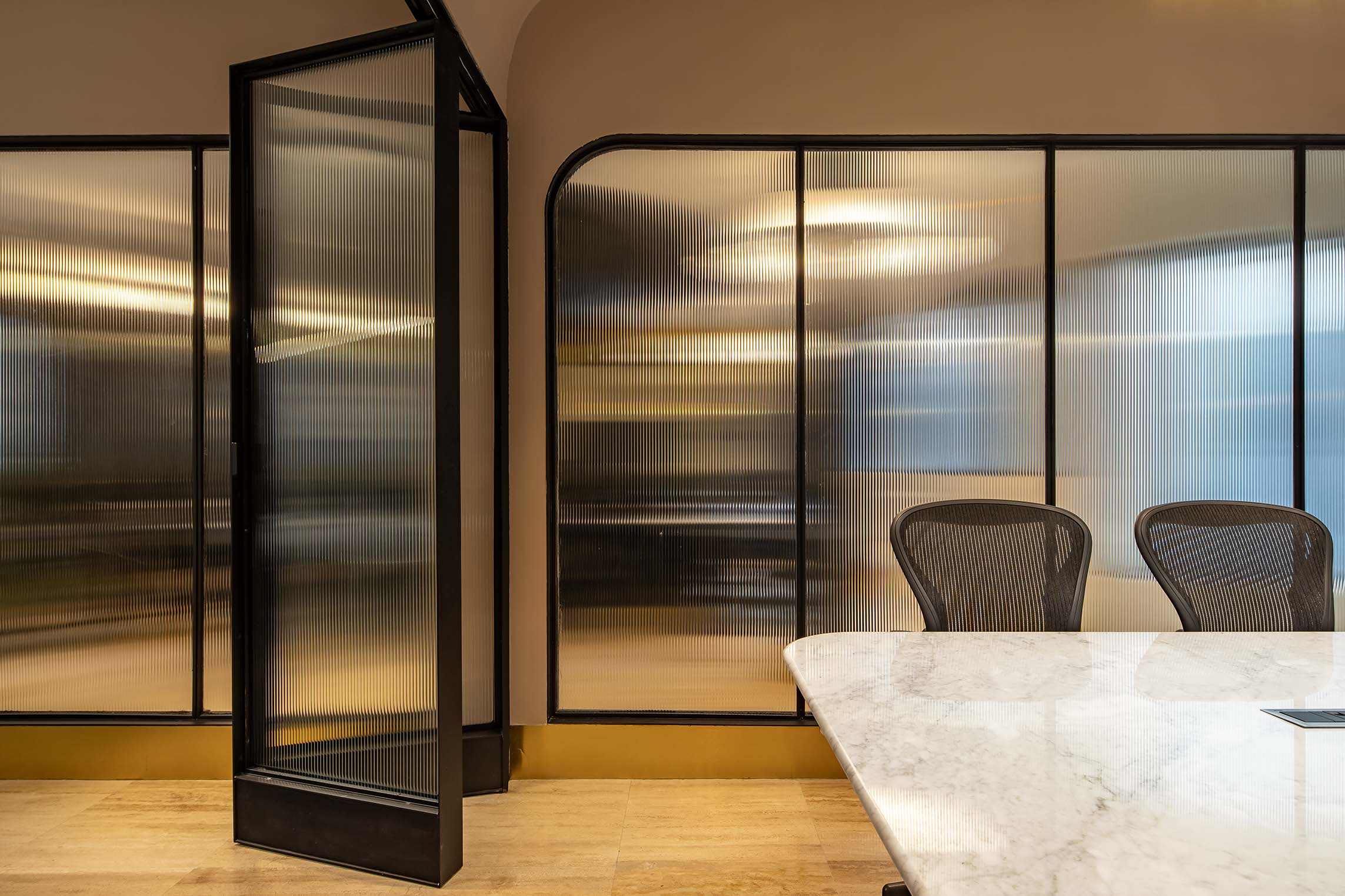 Un gran lambrín de madera con diseño estriado y un veteado piso de mármol travertino, un estilo muy del México de mediados de los 60, son el marco para las ventanas arqueadas de vidrio acanalado, que bañan el espacio de luz natural.