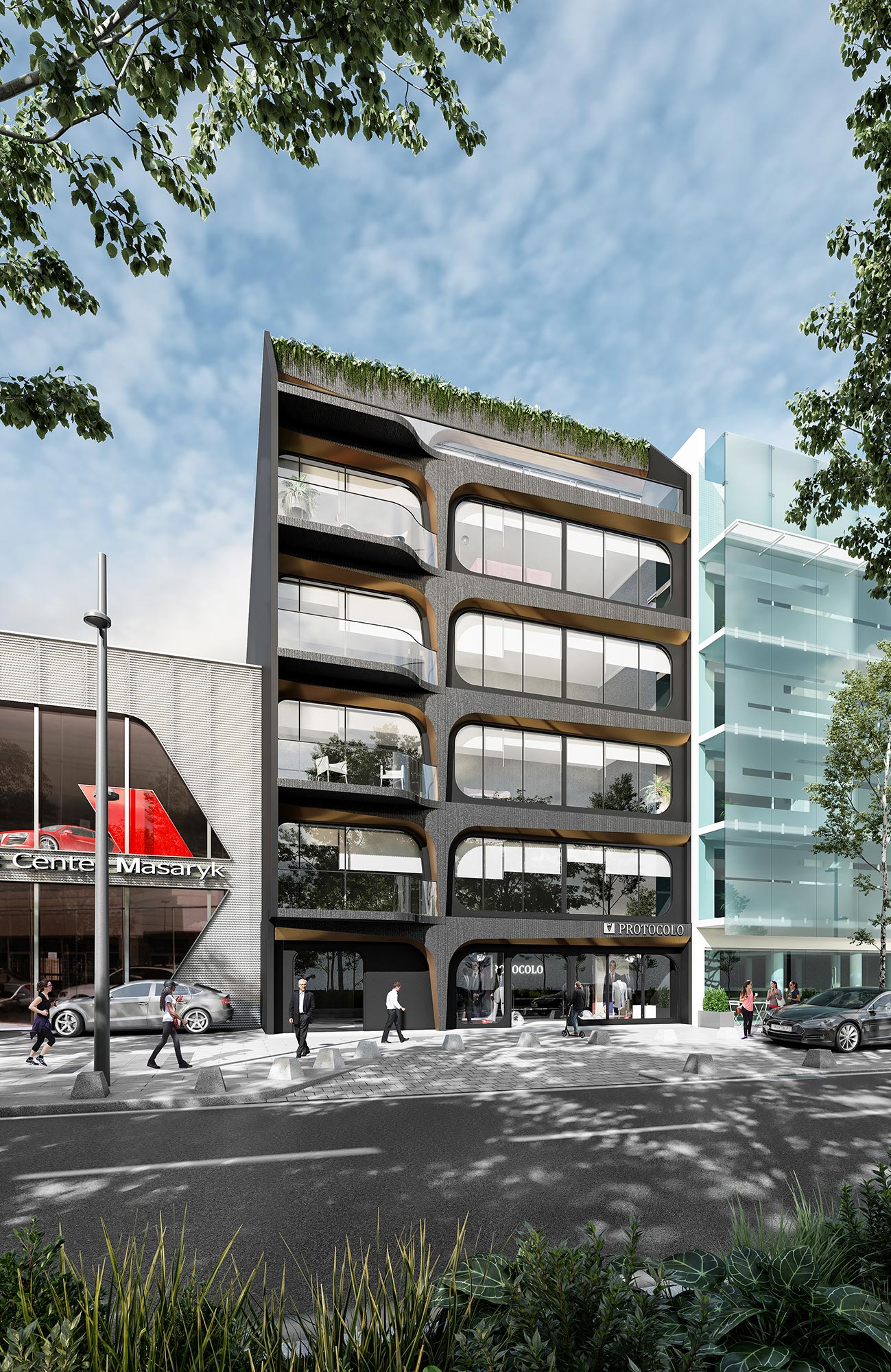 Located in the Polanco area, on Avenida Masaryk, one of the most cosmopolitan avenues in Latin America, where you can find trendy restaurants and bars, as well as boutiques of the world's most recognized luxury brands. This facade stands out for its peculiar shapes and materiality.