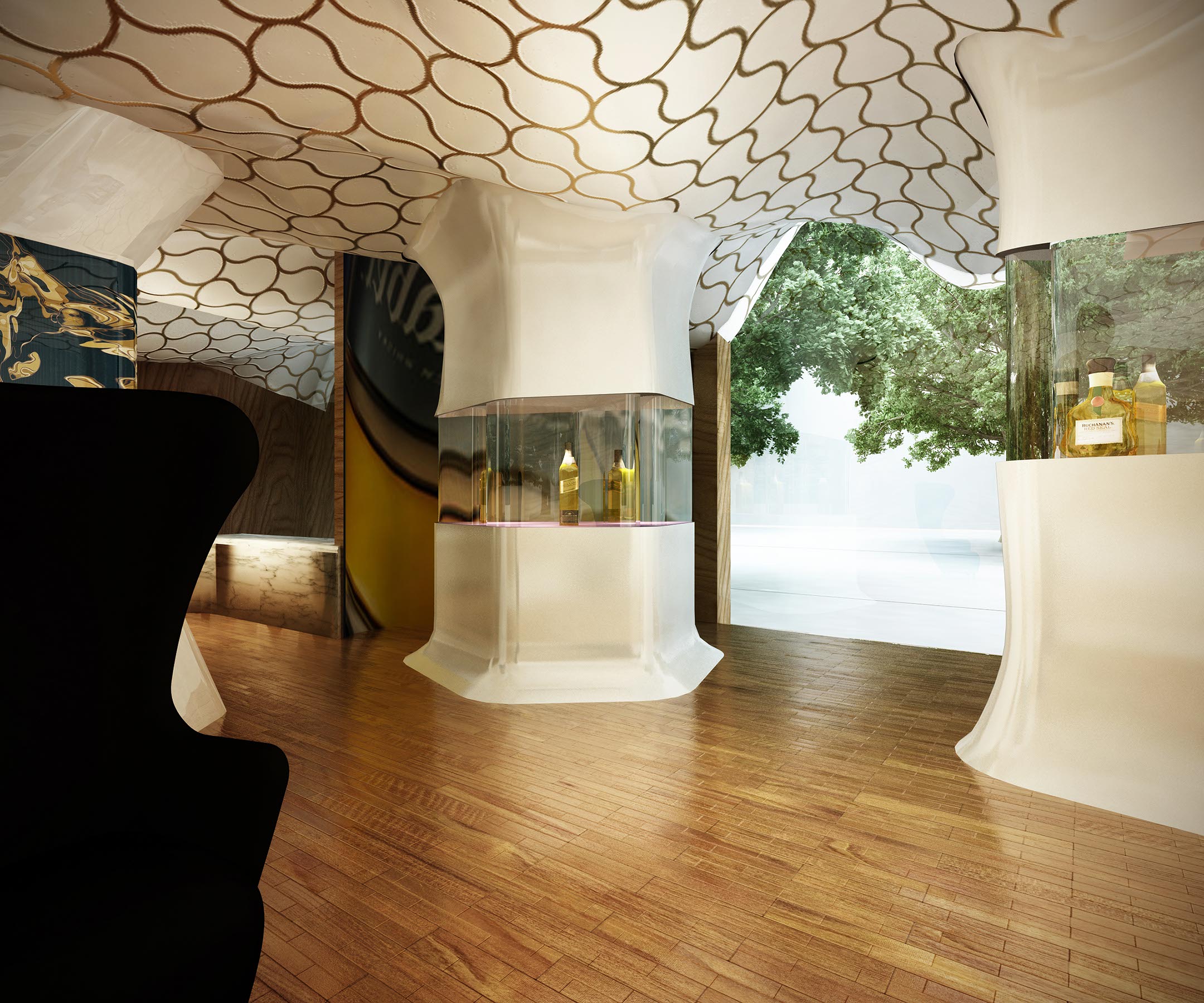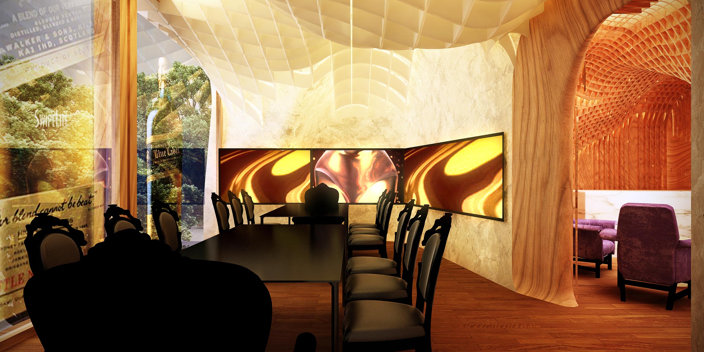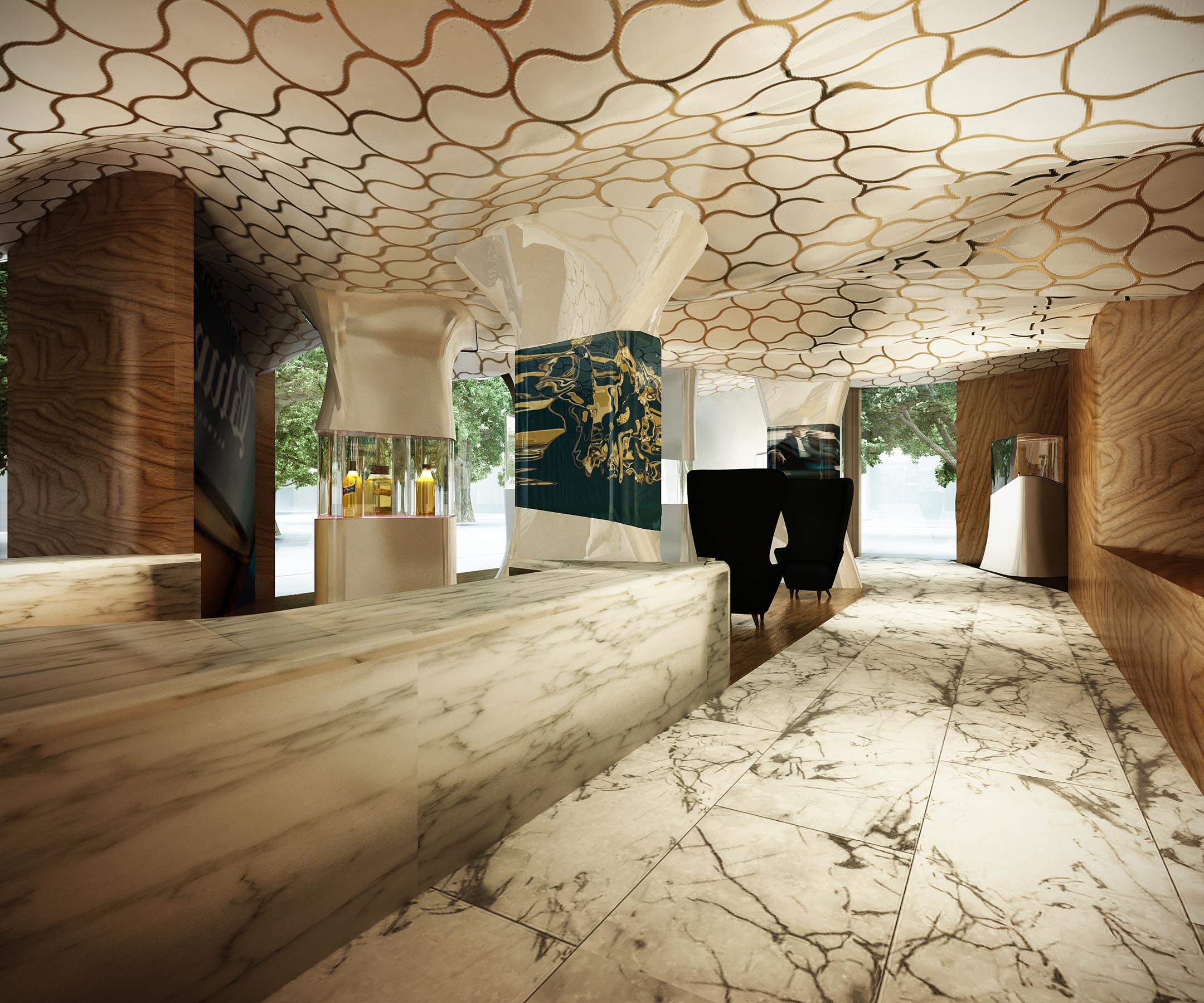 En contraste el plafón está compuesto por una intrincada superficie facetada que se adapta a la cambiante altura del espacio y a los elementos estructurales del edificio, el cual está terminado con un acabado espejo de aluminio anodizado dorado cortado con láser que refleja la vista en planta del local y afila los vértices del volumen creando puntos de interés para los clientes mientras son atendidos en los asientos reclinables.