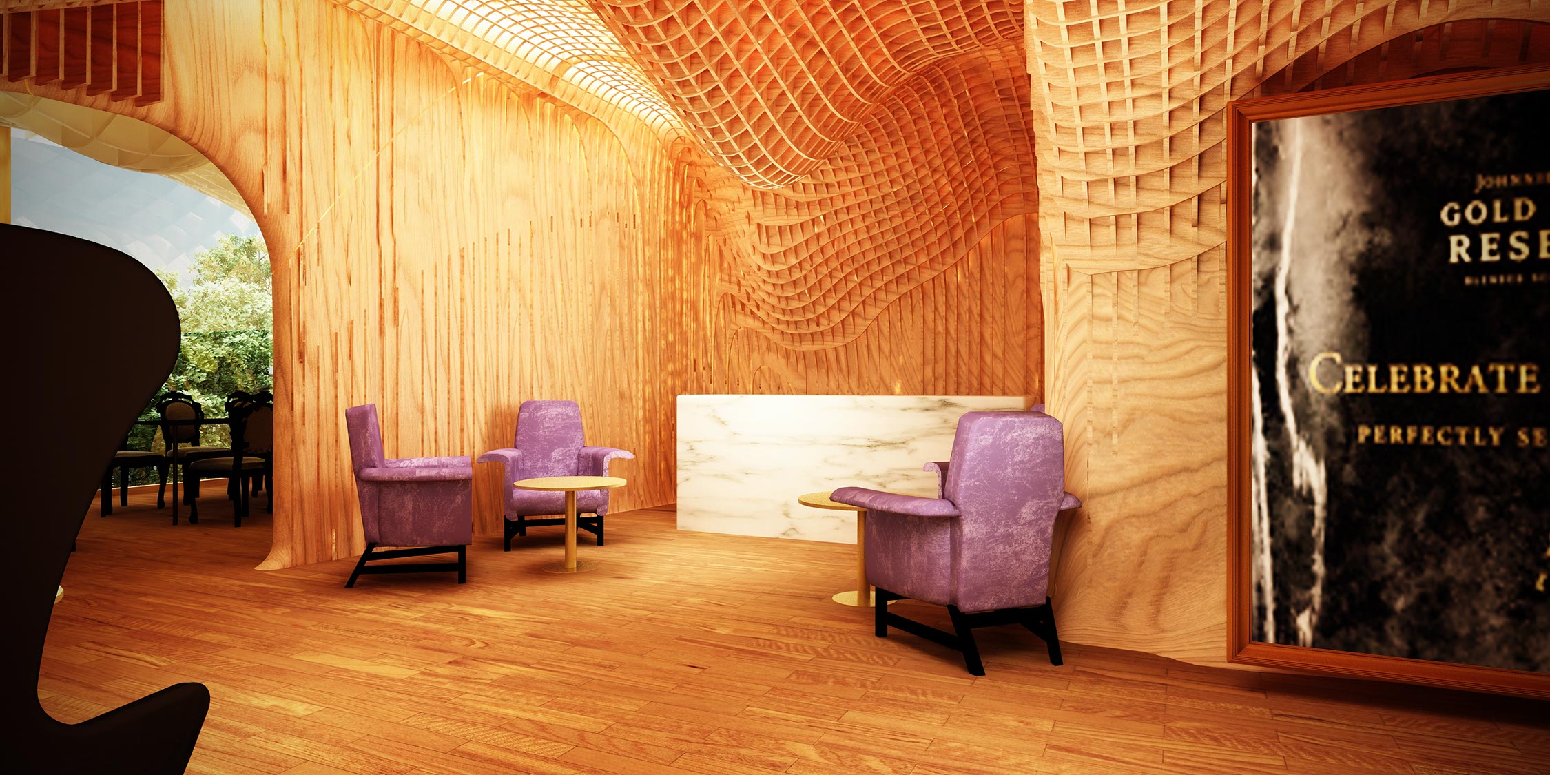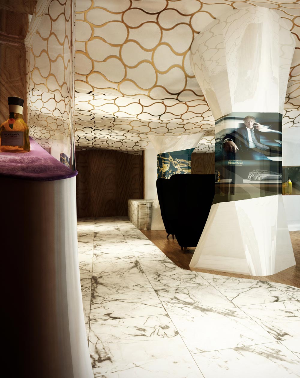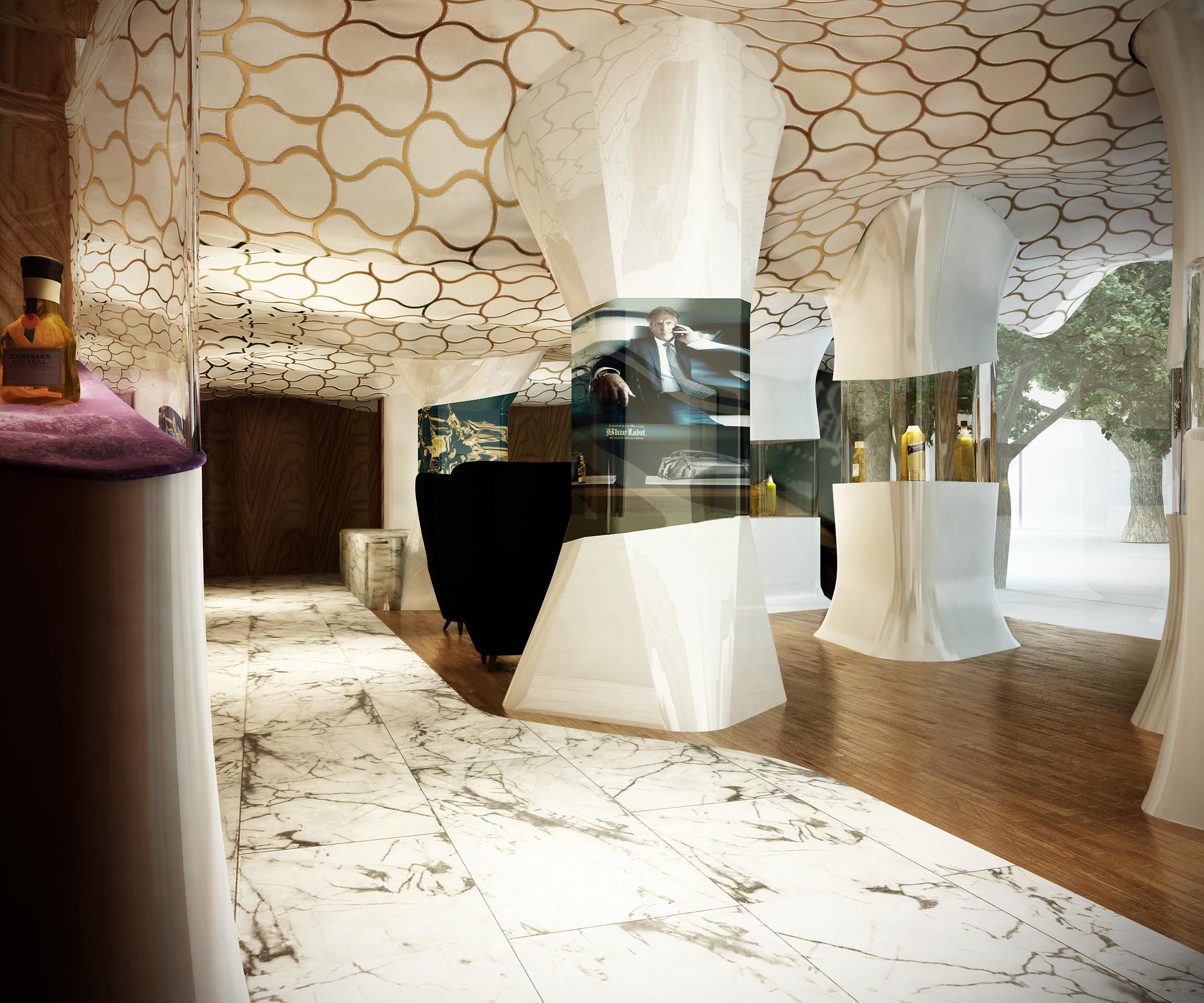 En contraste el plafón está compuesto por una intrincada superficie facetada que se adapta a la cambiante altura del espacio y a los elementos estructurales del edificio, el cual está terminado con un acabado espejo de aluminio anodizado dorado cortado con láser que refleja la vista en planta del local y afila los vértices del volumen creando puntos de interés para los clientes mientras son atendidos en los asientos reclinables.