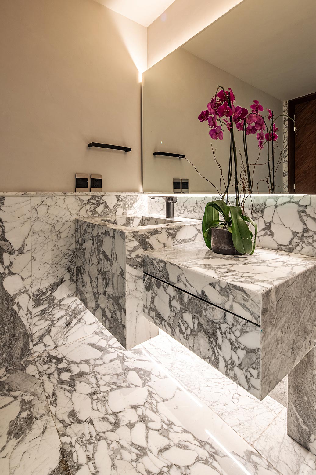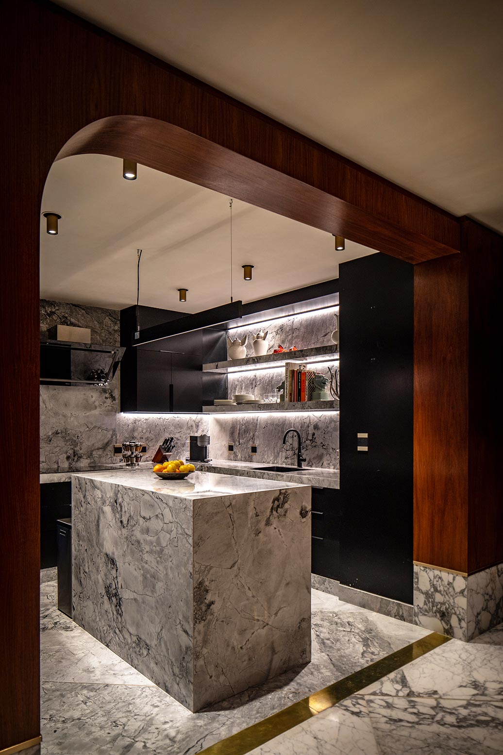 The lower half of the space relates in colors and materials to the long standing heritage of traditional barbershops including a black and white hexagonal tiles floor with a flower pattern and the Royal name greeting all the patrons at the entrance.