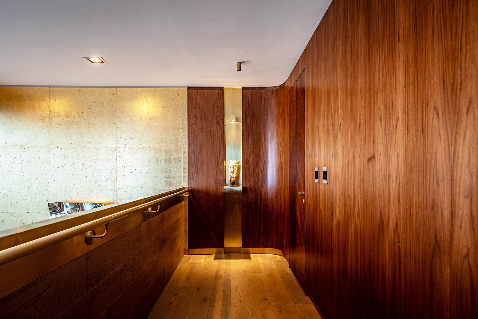 In contrast the ceiling is shaped with an intricate faceted surface that adapts to the changing heights of the space and the structural elements of the building finished with a laser-cut golden anodized aluminum reflective surface that mirrors the plan view of the shop and sharpens the edges of the volume creating a point of interest for the clients as they lay back on the service chairs.