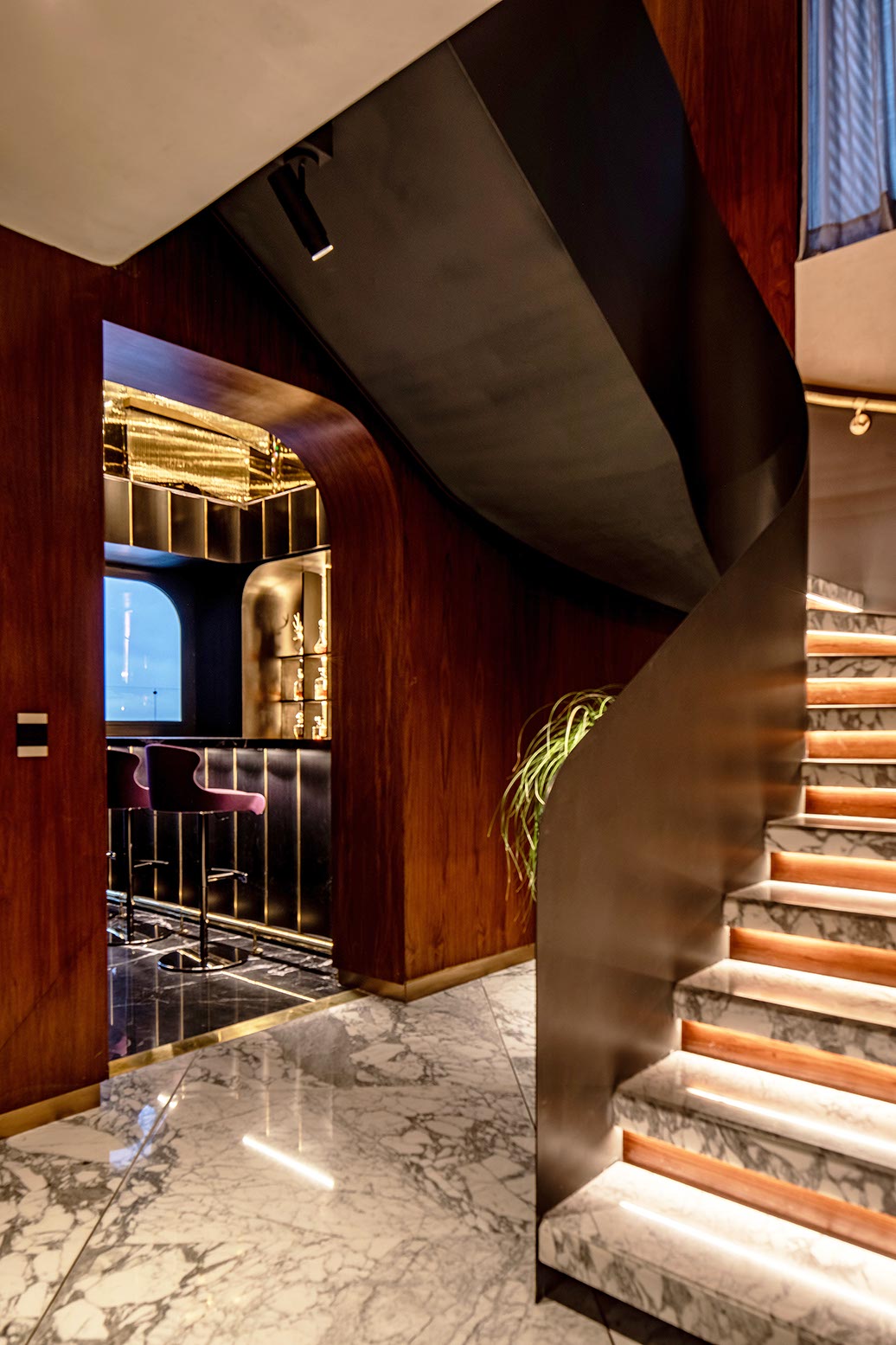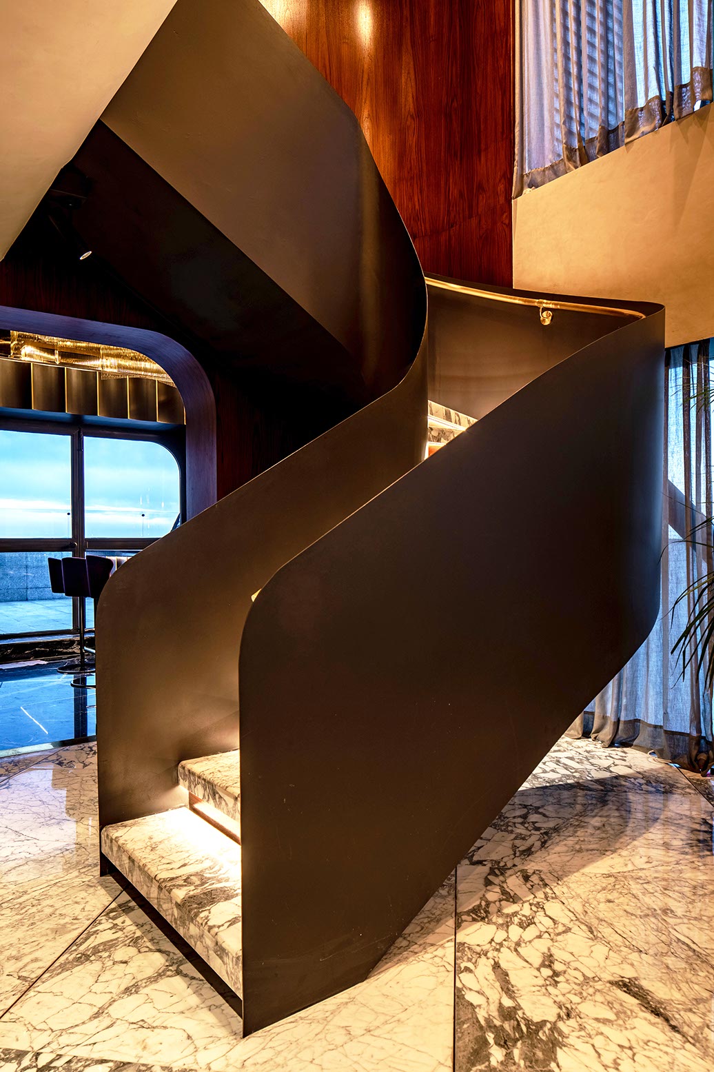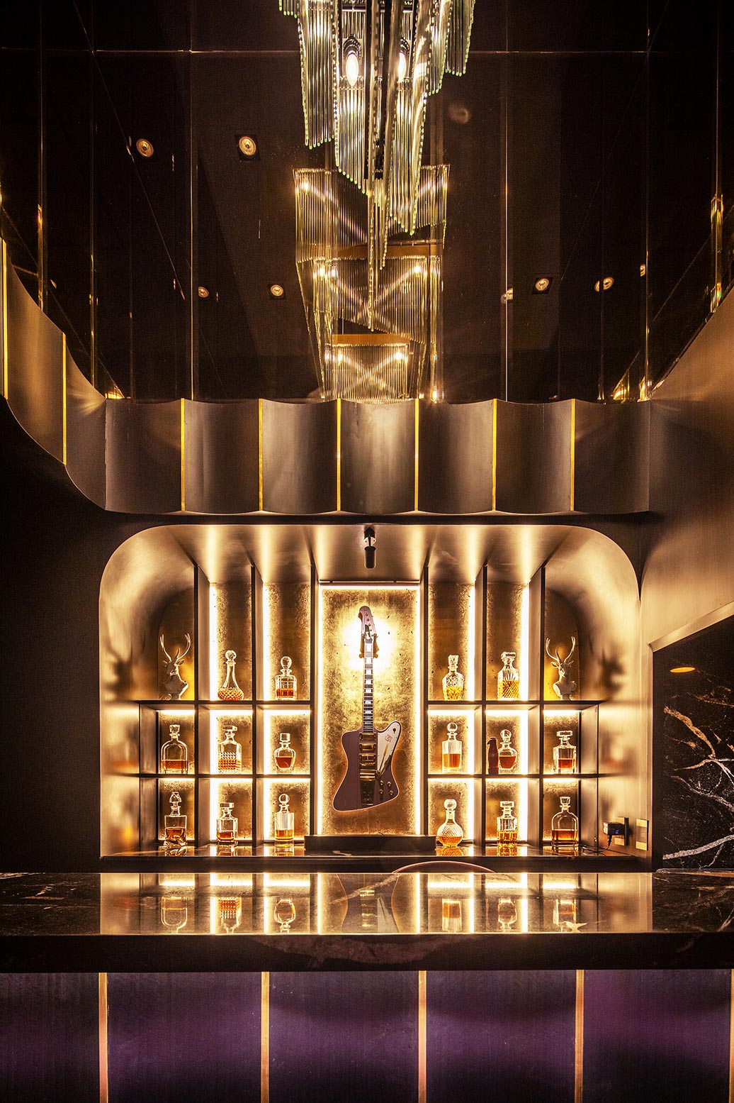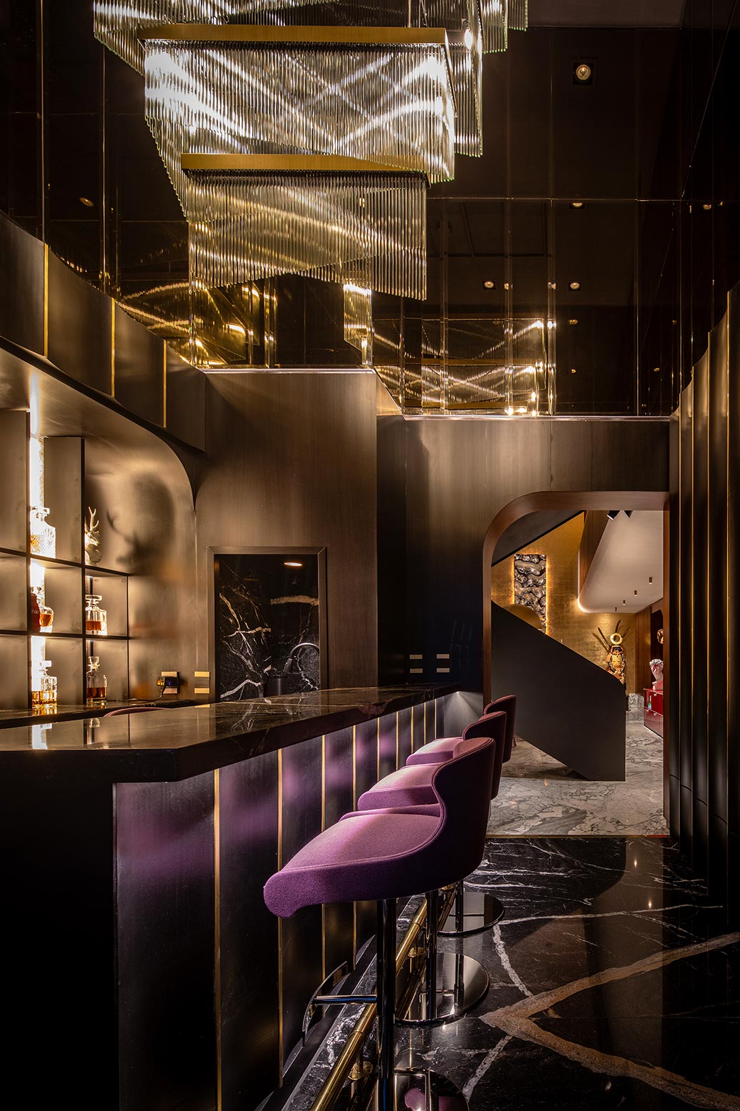 En contraste el plafón está compuesto por una intrincada superficie facetada que se adapta a la cambiante altura del espacio y a los elementos estructurales del edificio, el cual está terminado con un acabado espejo de aluminio anodizado dorado cortado con láser que refleja la vista en planta del local y afila los vértices del volumen creando puntos de interés para los clientes mientras son atendidos en los asientos reclinables.