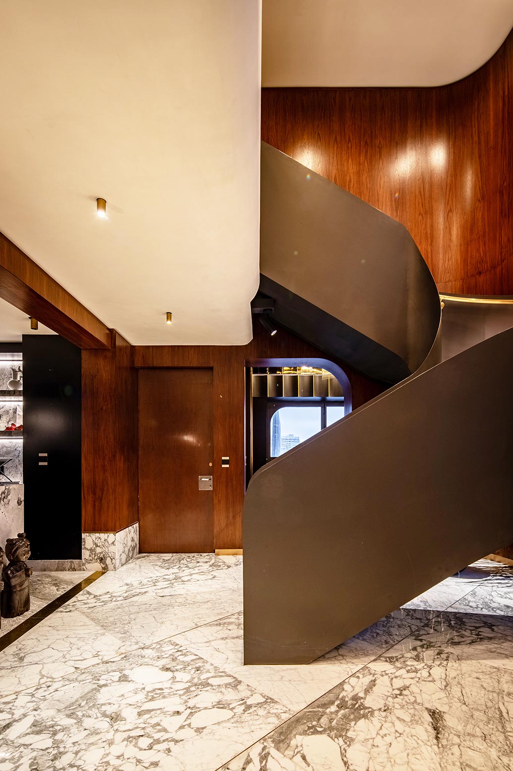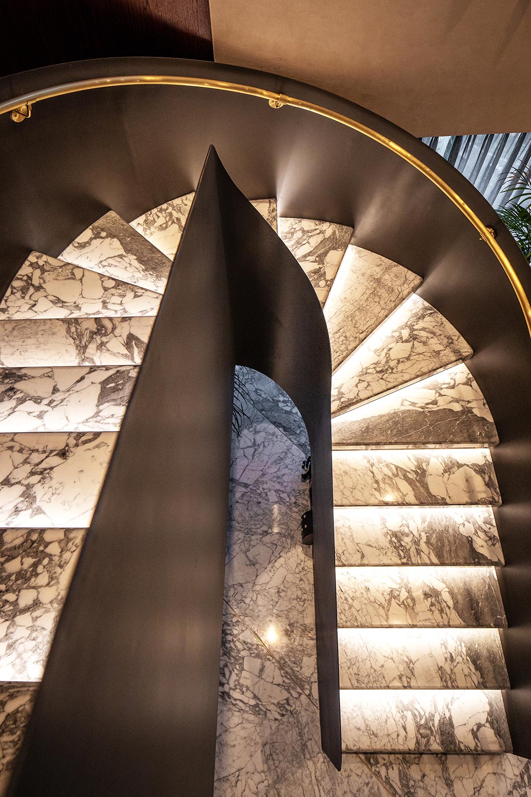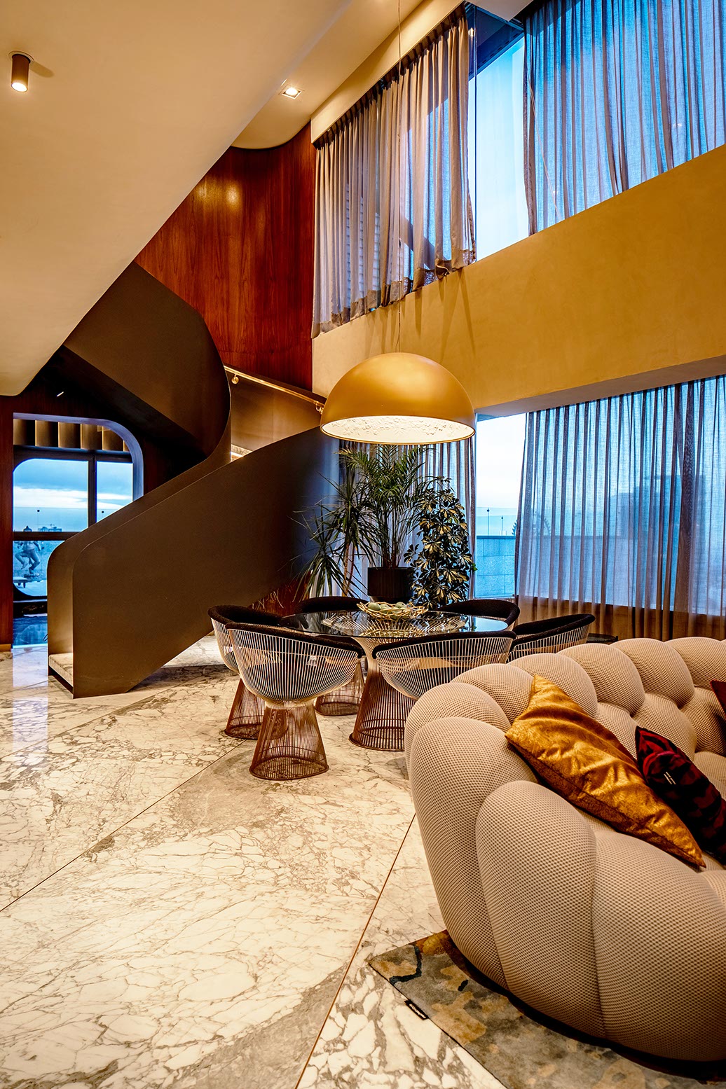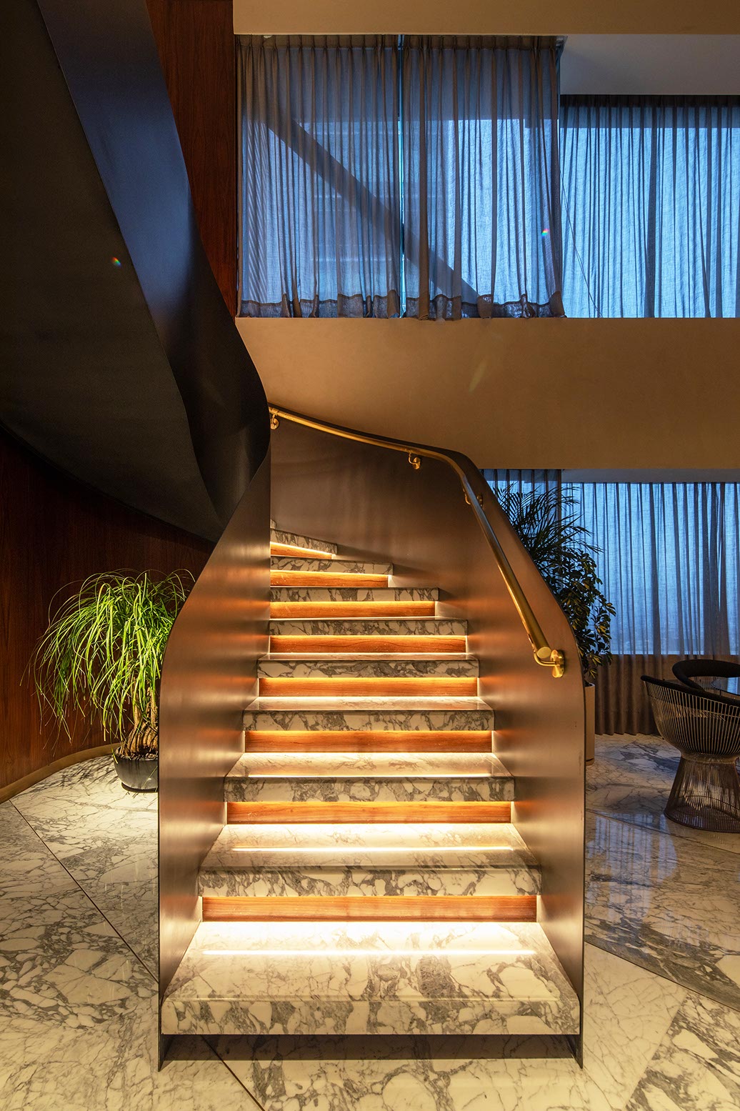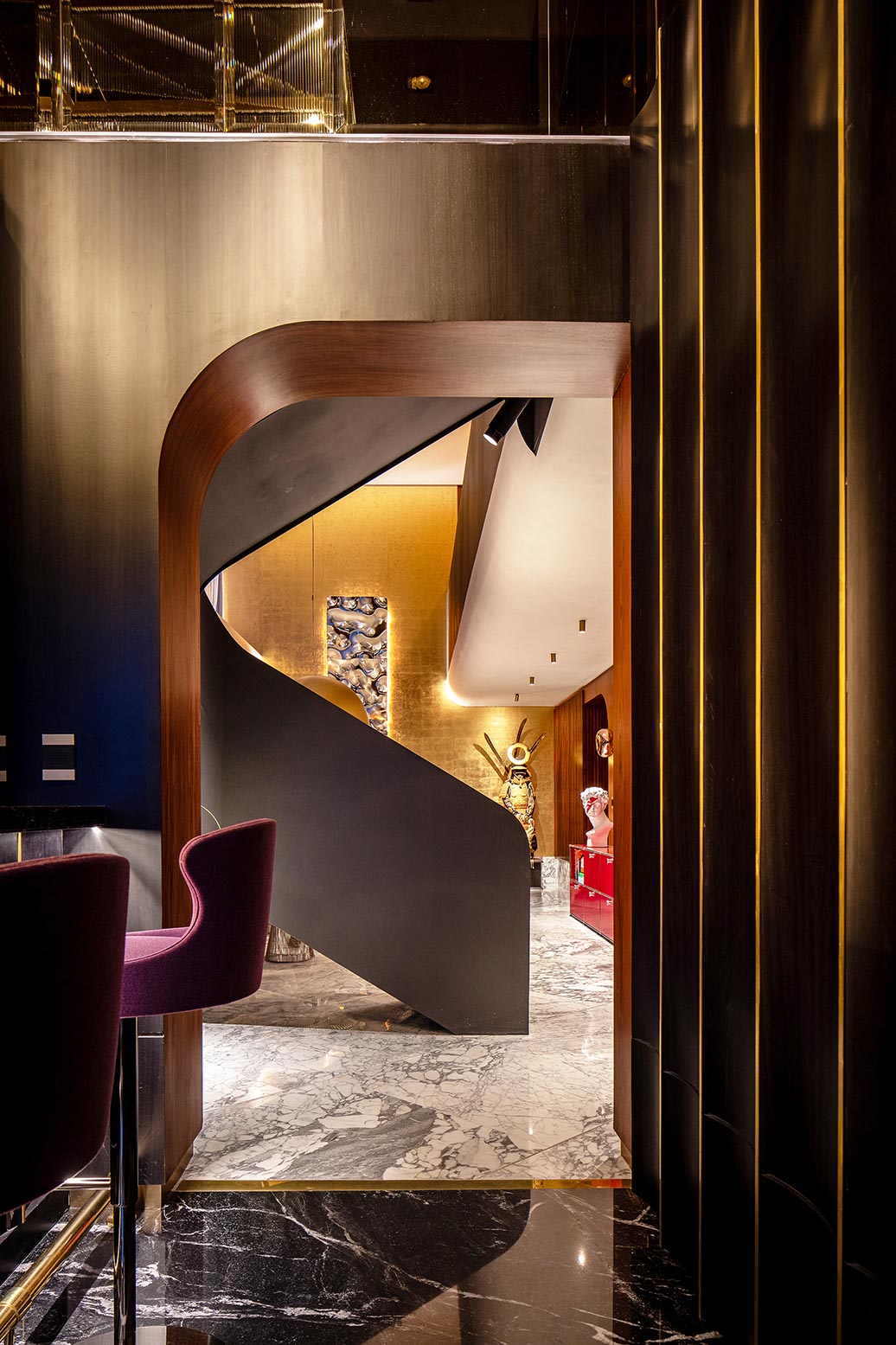 En contraste el plafón está compuesto por una intrincada superficie facetada que se adapta a la cambiante altura del espacio y a los elementos estructurales del edificio, el cual está terminado con un acabado espejo de aluminio anodizado dorado cortado con láser que refleja la vista en planta del local y afila los vértices del volumen creando puntos de interés para los clientes mientras son atendidos en los asientos reclinables.