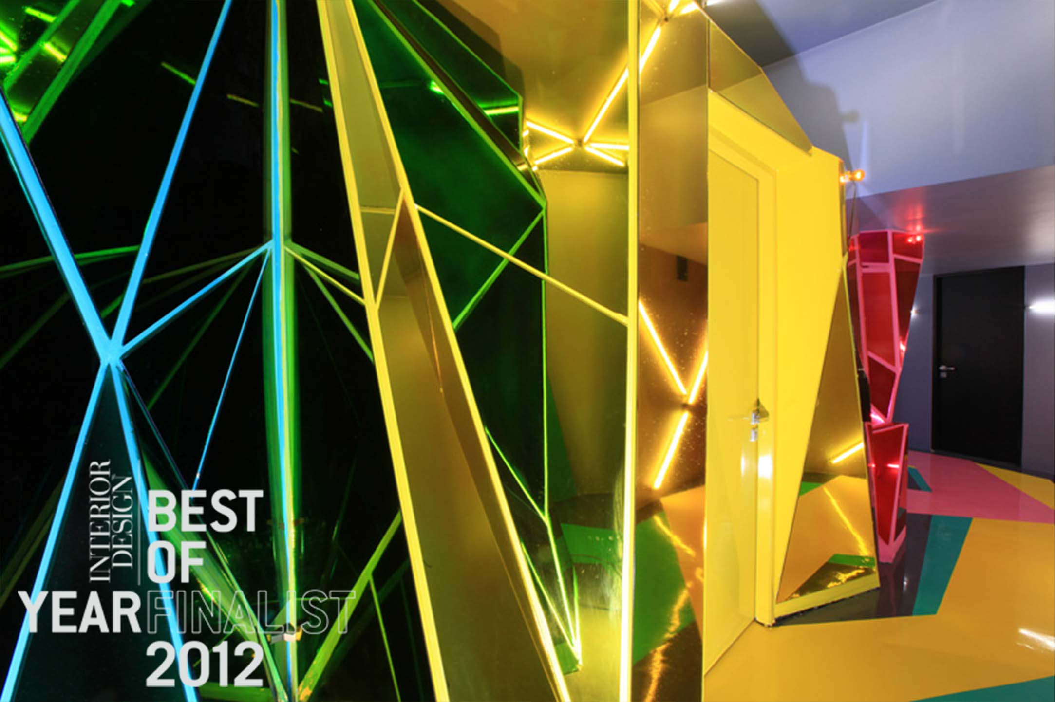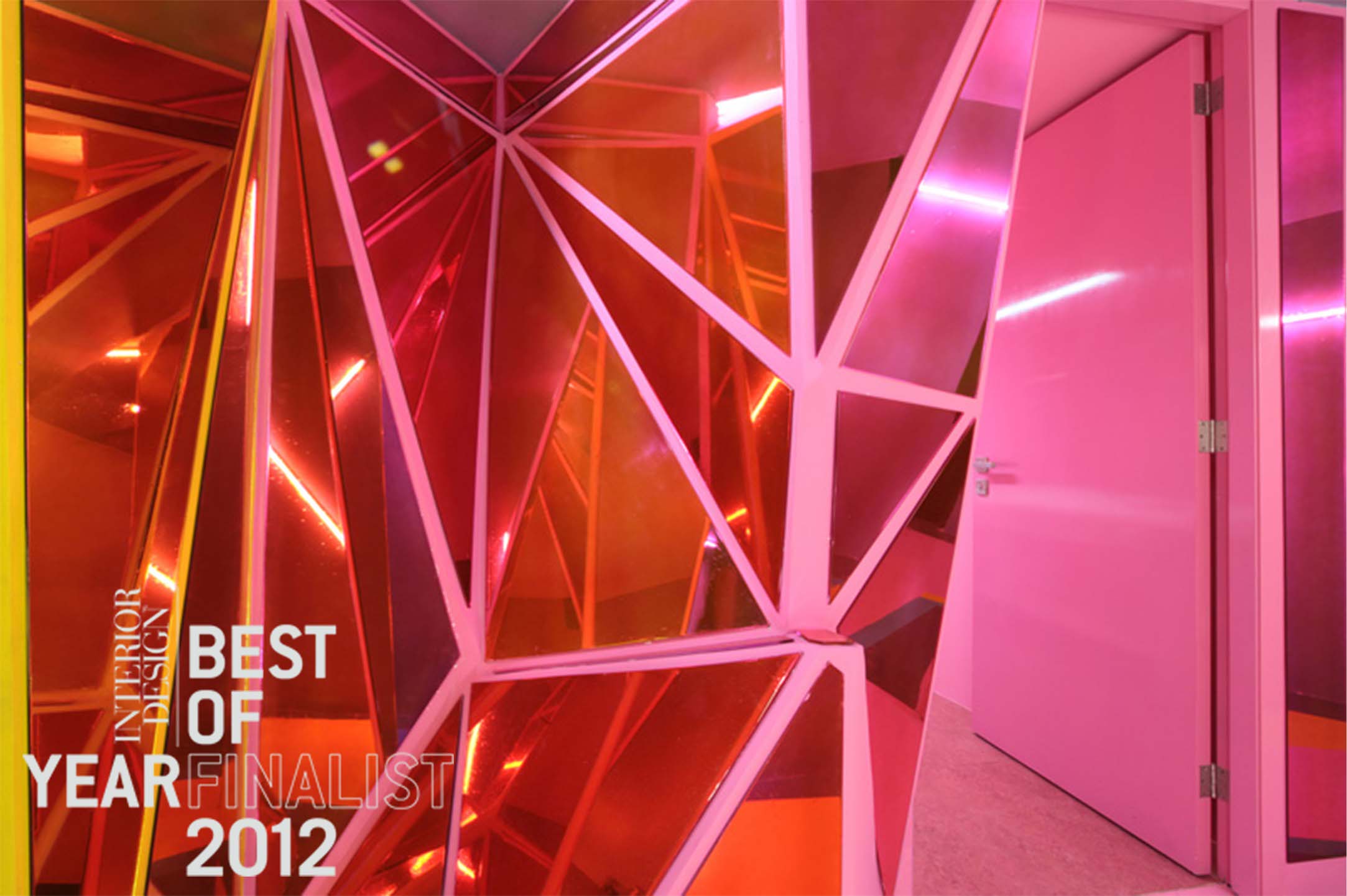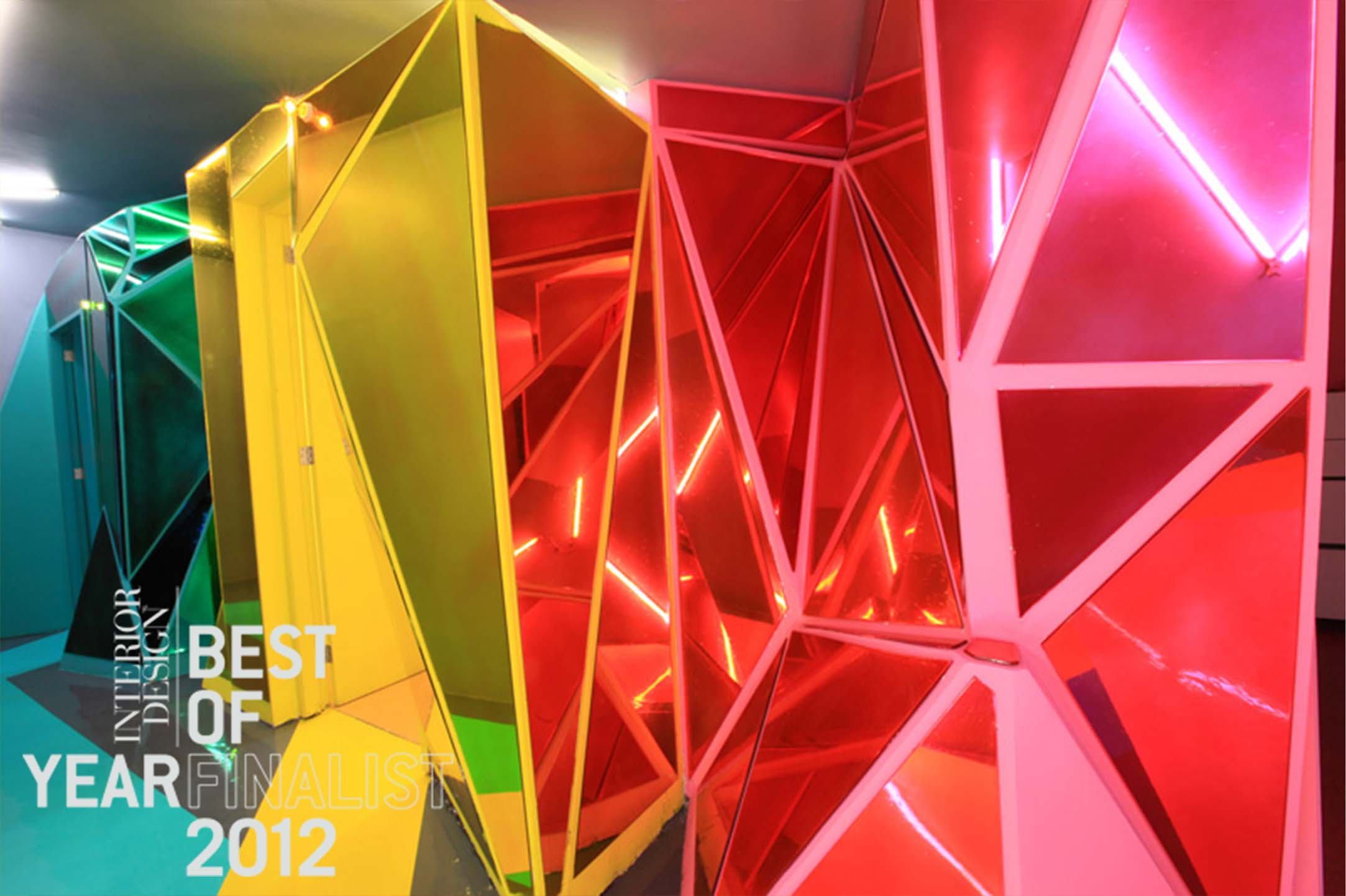En contraste el plafón está compuesto por una intrincada superficie facetada que se adapta a la cambiante altura del espacio y a los elementos estructurales del edificio, el cual está terminado con un acabado espejo de aluminio anodizado dorado cortado con láser que refleja la vista en planta del local y afila los vértices del volumen creando puntos de interés para los clientes mientras son atendidos en los asientos reclinables.