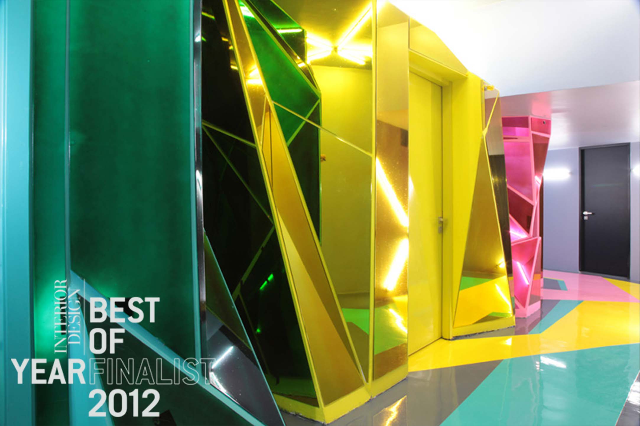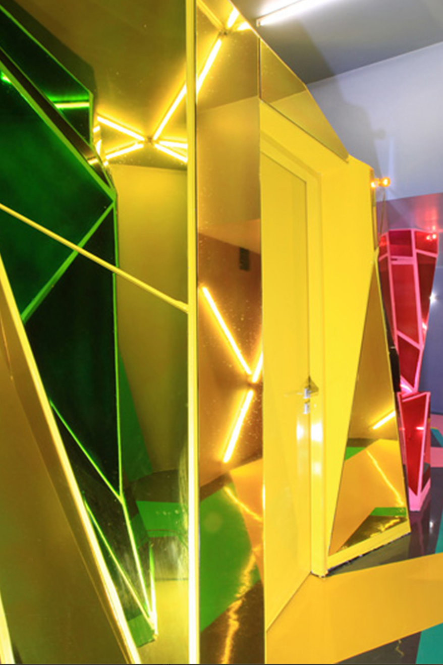 In contrast the ceiling is shaped with an intricate faceted surface that adapts to the changing heights of the space and the structural elements of the building finished with a laser-cut golden anodized aluminum reflective surface that mirrors the plan view of the shop and sharpens the edges of the volume creating a point of interest for the clients as they lay back on the service chairs.